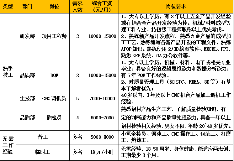 公司擁有廣東省唯一的鋁車體工程技術(shù)研究中心!扳伱冷X材”品牌先后獲得鋁型材行業(yè)內(nèi)的最高榮譽(yù):“中國馳名商標(biāo)”、“中國著名品牌”、“中國名優(yōu)產(chǎn)品”;公司榮獲“國家高新技術(shù)企業(yè)”、廣東省“專精特新”企業(yè)等榮譽(yù)稱號(hào)。因生產(chǎn)發(fā)展需要,誠聘以下崗位: