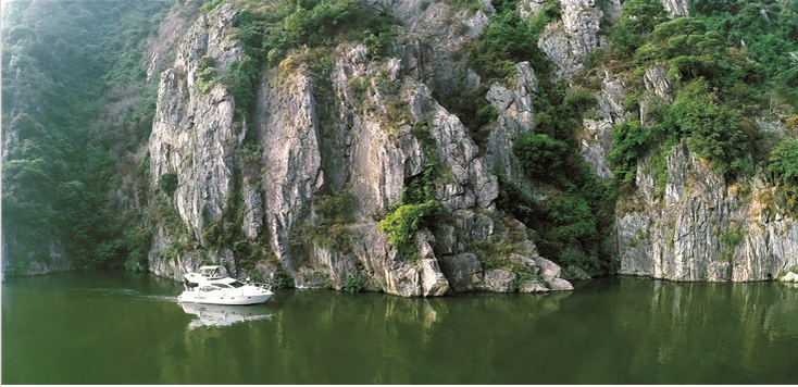 乘坐在快艇上乘風破浪,在江面上疾馳,兩岸的青山巍峨聳立,偶有成群的白鷺在江面上拍著翅膀飛過,不遠處還有農(nóng)舍、田園,眼前的景色就像一幅優(yōu)美的山水畫。唐代名相張九齡就在其詩作《湞陽峽》中寫道:“行舟傍越岑,窈窕越溪深。水暗先秋冷,山晴當晝陰”,表現(xiàn)了峽谷的幽深。即將開通的廣樂高速,也有架橋在江面上經(jīng)過,那巨大高聳的橋梁,本身也是一景。現(xiàn)代化的橋梁與古樸的江景相映成趣,“一橋飛架南北”的景觀讓人嘆為觀止。景區(qū)所提供的快艇也是全新的,里面電視、音響、洗手間、酒吧等一應(yīng)俱全,與友人在這里一邊品茶一邊欣賞兩岸景色,美哉快哉!